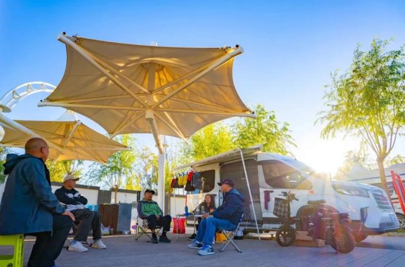 在額濟(jì)納旗居延驛站,不少自駕游旅客搭起帳篷、支起飯桌,三五好友圍坐在一起,盡情探索“露營+”新玩法。旅游旺季期間,居延驛站全力保障車位供給,配備完善的水電系統(tǒng),著力提升游客體驗感?!斑@里不僅風(fēng)光獨特,而且旅游設(shè)施完善、服務(wù)周到,真是不虛此行?!眮碜陨虾5摹澳β冒l(fā)燒友”云楓連連稱贊。