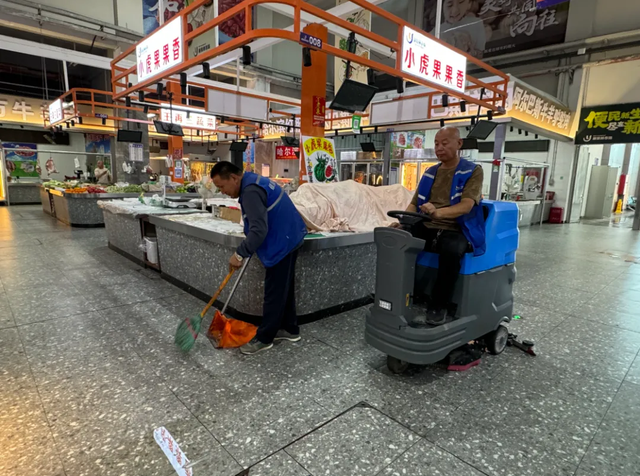 記者在現(xiàn)場(chǎng)看到,市場(chǎng)內(nèi)燈火通明,幾名保潔人員正在細(xì)致地擦拭攤位,有的則在清掃地面上的雜物。而在市場(chǎng)的主通道上,工作人員羅全貴正開著洗地機(jī)緩緩前行,機(jī)器過后,原本有些油污的地面變得干凈整潔。