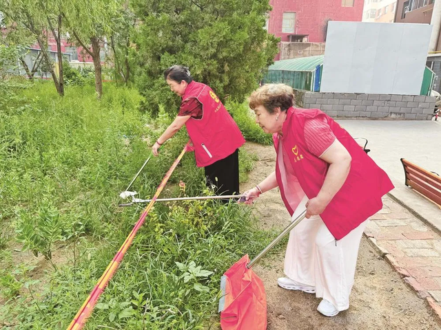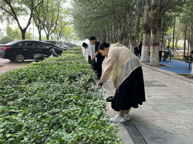 田永成今年66歲,精神矍鑠,手里拿著一把夾子,彎著腰仔細(xì)地在草坪上搜尋垃圾?!翱吹健莱怯形摇鞘星鍧嵢招袆?dòng)的倡議書,我立馬就給隊(duì)員們打了電話,大家都特別積極,好多人報(bào)名參與?!碧镉莱尚χf,額頭上的汗珠順著臉頰滑落。