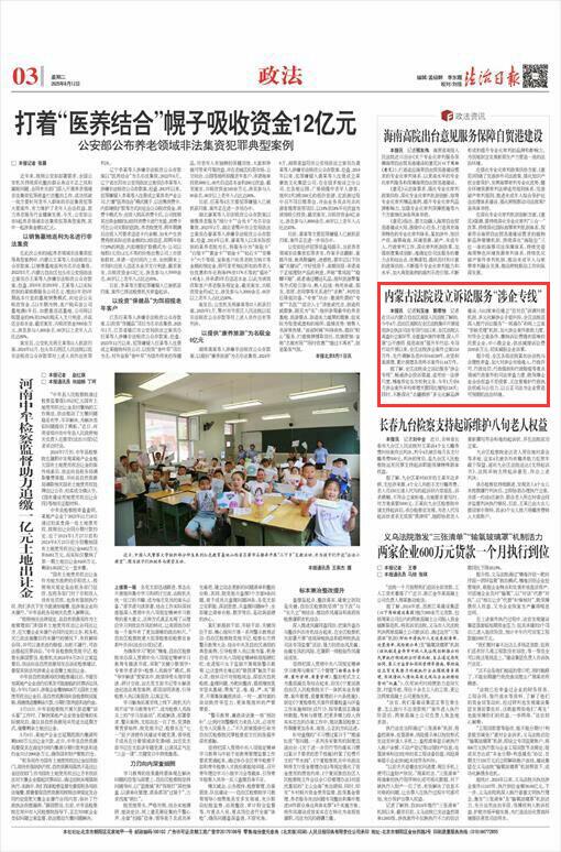 2025年8月12日,《法治日報》第3版刊發(fā)題為《內(nèi)蒙古法院設(shè)立訴訟服務(wù)“涉企專線”》的文章,報道了自治區(qū)高院在全區(qū)法院集中開展規(guī)范涉企執(zhí)法司法專項行動以來,全區(qū)法院認(rèn)真查糾立案環(huán)節(jié),全面查糾案件審理,深入開展“公開透明 規(guī)范高效”提升年行動。