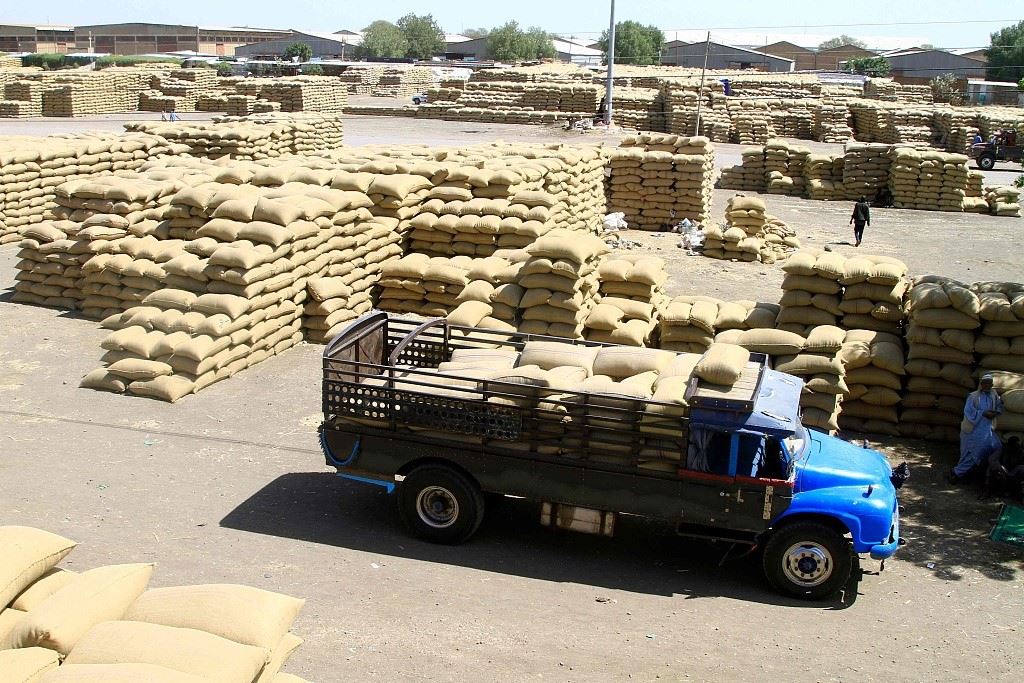 當(dāng)?shù)貢r(shí)間2024年2月22日,蘇丹東部杰達(dá)雷夫市,卡車(chē)在一個(gè)市場(chǎng)里運(yùn)送谷物。聯(lián)合國(guó)糧食計(jì)劃署表示,蘇丹長(zhǎng)期武裝沖突導(dǎo)致當(dāng)?shù)亟^大多數(shù)人都面臨饑餓。