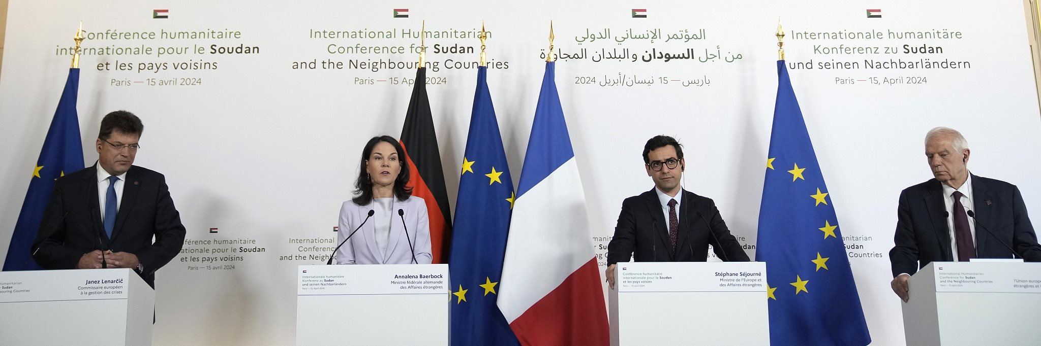 當(dāng)?shù)貢r(shí)間2024年4月15日,法國(guó)巴黎,法國(guó)外交部長(zhǎng)斯特凡納·塞茹爾內(nèi)(右二),德國(guó)外交部長(zhǎng)安娜萊娜·貝爾伯克,歐盟危機(jī)管理專(zhuān)員約翰·萊納西奇(左)和歐盟外交與安全事務(wù)高級(jí)代表何塞普·博雷利參加了蘇丹及其鄰國(guó)國(guó)際人道主義會(huì)議的聯(lián)合新聞發(fā)布會(huì)。