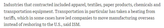 文章指出,美國制造業(yè)活動萎縮的行業(yè)主要包括服裝、紡織品、紙制品、化工產(chǎn)品和運輸業(yè)。文章表示,雖然當前美國工廠產(chǎn)量有所增加,但未售出的庫存卻急劇增加。需求增長放緩,這在出口市場體現(xiàn)尤為明顯,而受關(guān)稅影響,出口市場的前景更加暗淡。