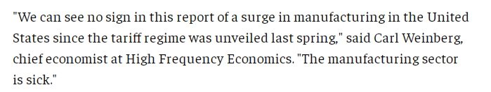 文章指出,美國政府曾辯稱,加征關(guān)稅是保護美國國內(nèi)制造業(yè)的必要之舉,但經(jīng)濟學(xué)家則認為,由于包括勞動力短缺在內(nèi)的結(jié)構(gòu)性問題,美國制造業(yè)已無法恢復(fù)昔日輝煌。文章援引高頻經(jīng)濟咨詢公司首席經(jīng)濟學(xué)家卡爾·溫伯格(Carl Weinberg)的話表示,“從(ISM)這份報告中,我沒有看到自關(guān)稅政策出臺以來,美國制造業(yè)出現(xiàn)任何增長的跡象,美國制造業(yè)已經(jīng)病了。”