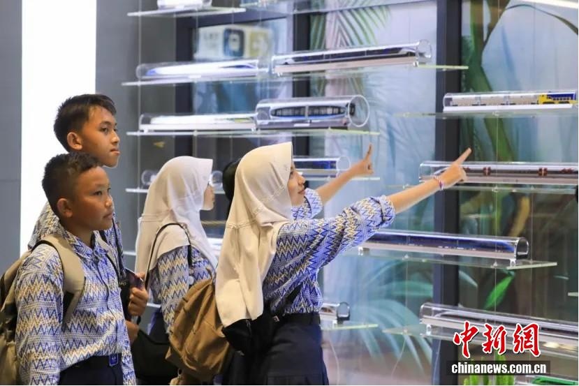 當地時間2024年10月17日,一群印尼學生在印尼雅加達的雅萬高鐵動車組科普文化交流基地參觀。 中新社記者 李志全 攝