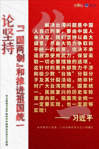 解決臺灣問題、實現祖國完全統(tǒng)一,是中國共產黨矢志不渝的歷史任務,是全體中華兒女的共同愿望,是實現中華民族偉大復興的必然要求。必須堅持貫徹新時代黨解決臺灣問題的總體方略,牢牢把握兩岸關系主導權和主動權,堅定不移推進祖國統(tǒng)一大業(yè)。