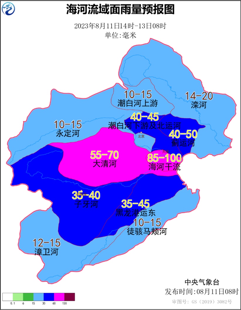 海河流域面雨量預(yù)報(bào):11日下午至12日,海河流域中部子流域面雨量35~50毫米,其中大清河面雨量55~70毫米、海河干流85~100毫米。