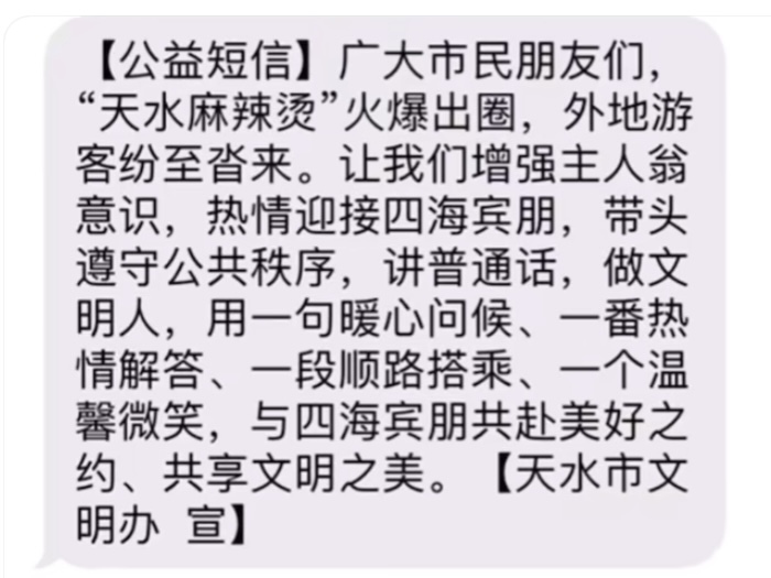 事實上,自3月以來天水在網絡“出圈”后,游客就絡繹不絕。有多位當地網友“曬”的消息顯示,3月20日收到天水市發(fā)布的“公益短信”,建議當地市民“增強主人翁意識,熱情迎接四海賓朋……用一句暖心問候、一番熱情解答、一段順路搭乘、一個溫馨微笑,與四海賓朋共赴美好之約……”