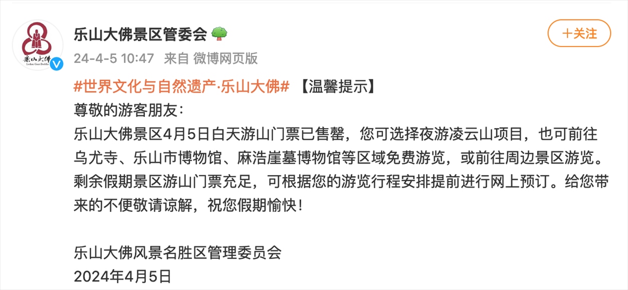 而據樂山大佛景區(qū)管委會發(fā)布的公告,4月4日15:04,樂山大佛景區(qū)當日的白天游山門票已售罄;4月5日10:47,樂山大佛景區(qū)當日的白天游山門票就已售罄。