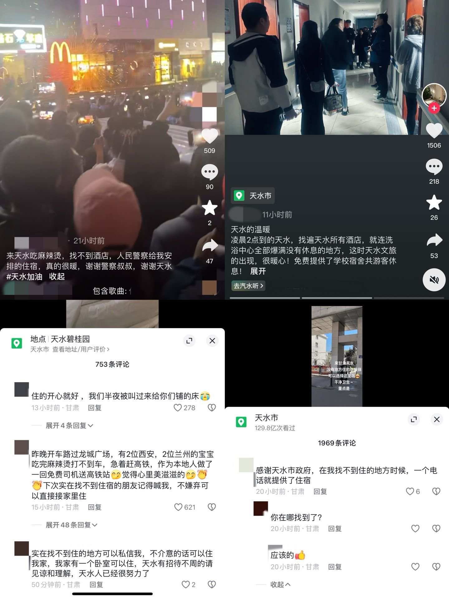 在社交平臺上,不少網友發(fā)布了找不到住宿而被幫助的內容,紛紛表示“感謝天水”。