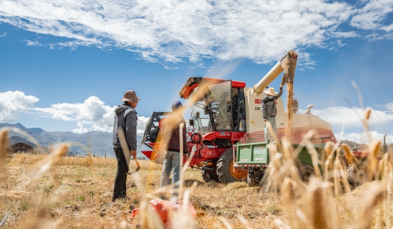 9月23日,在西藏拉薩市林周縣松盤鄉(xiāng)崗巴村,農(nóng)民用收割機(jī)收獲青稞。