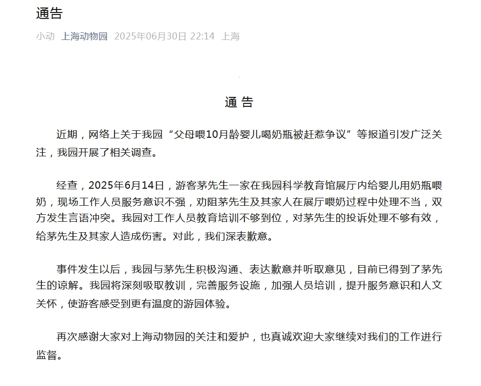 《通告》中稱,經(jīng)查,2025年6月14日,游客茅先生一家在該動(dòng)物園科學(xué)教育館展廳內(nèi)給嬰兒用奶瓶喂奶,現(xiàn)場(chǎng)工作人員服務(wù)意識(shí)不強(qiáng),勸阻茅先生及其家人在展廳喂奶過程中處理不當(dāng),雙方發(fā)生言語沖突。對(duì)工作人員教育培訓(xùn)不夠到位,對(duì)茅先生的投訴處理不夠有效,給茅先生及其家人造成傷害。對(duì)此,上海動(dòng)物園深表歉意。
