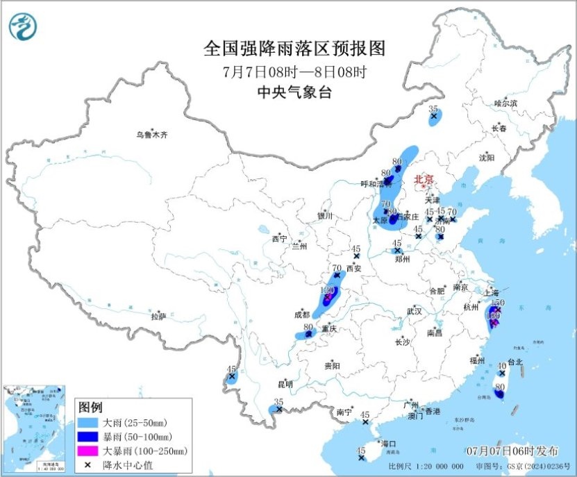 預(yù)計(jì),7月7日08時(shí)至8日08時(shí),浙江東部、內(nèi)蒙古中部、山西中北部、河北西北部和西南部、山東北部、河南西北部、陜西西南部、四川東部、云南西南部、臺(tái)灣島等地部分地區(qū)有大到暴雨,其中,浙江東部、四川東部等地部分地區(qū)有大暴雨(100~180毫米)。上述部分地區(qū)伴有短時(shí)強(qiáng)降水(最大小時(shí)降雨量20~50毫米,局地可超過70毫米),局地有雷暴大風(fēng)等強(qiáng)對(duì)流天氣。中央氣象臺(tái)7月7日06時(shí)繼續(xù)發(fā)布暴雨藍(lán)色預(yù)警。