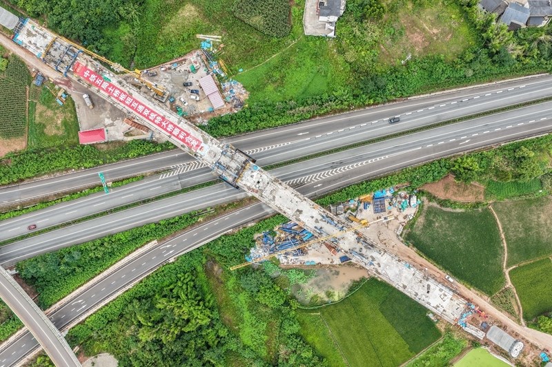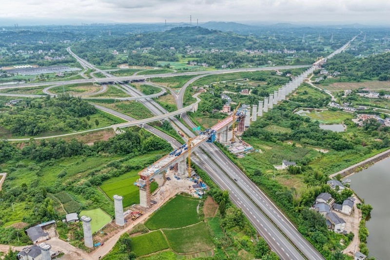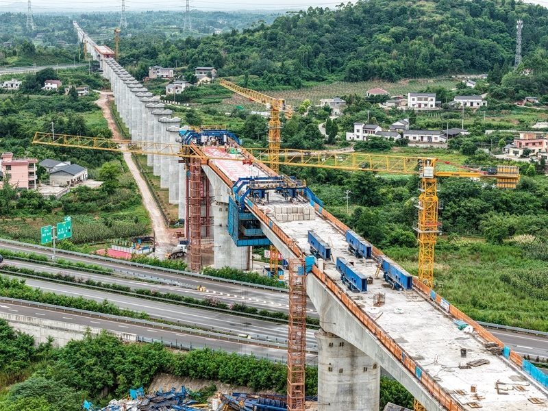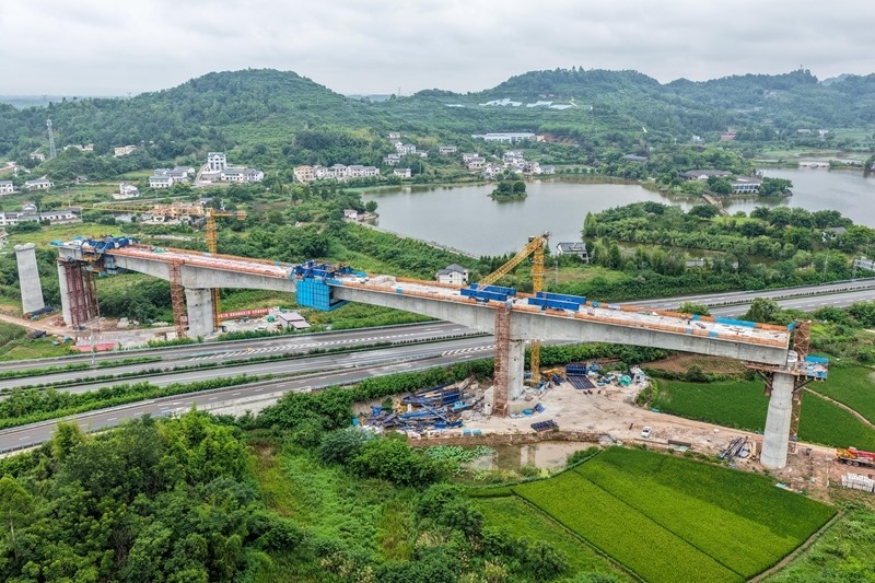 這是7月8日拍攝的成渝中線高鐵土橋樞紐互通雙線特大橋建設(shè)現(xiàn)場(無人機(jī)照片)。