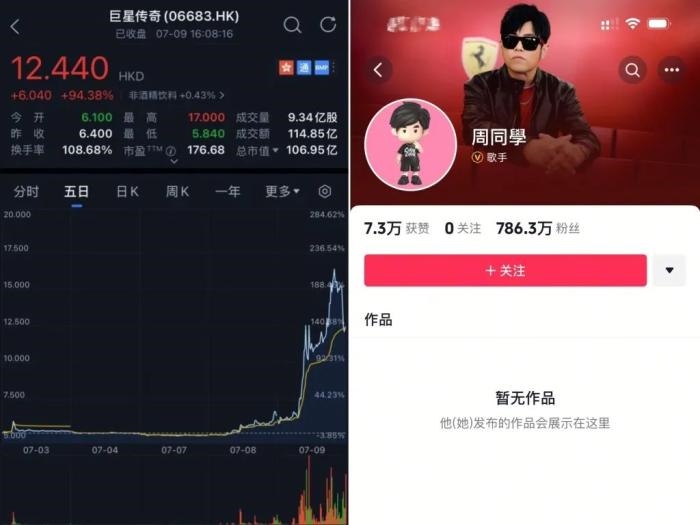 7月9日,周杰倫宣布入駐抖音平臺,賬號以其官方二次元IP形象“周同學”命名,頭像也是“周同學”IP化身,認證身份為歌手。受該消息的提振,“周杰倫概念股”巨星傳奇(6683.HK)9日收漲94.37%,收盤價為12.44港元,總市值106.95億港元,單日成交量9.34億股,成交額達114.85億港元;盤中一度拉升漲165.62%,兩個交易日暴漲146.34%。