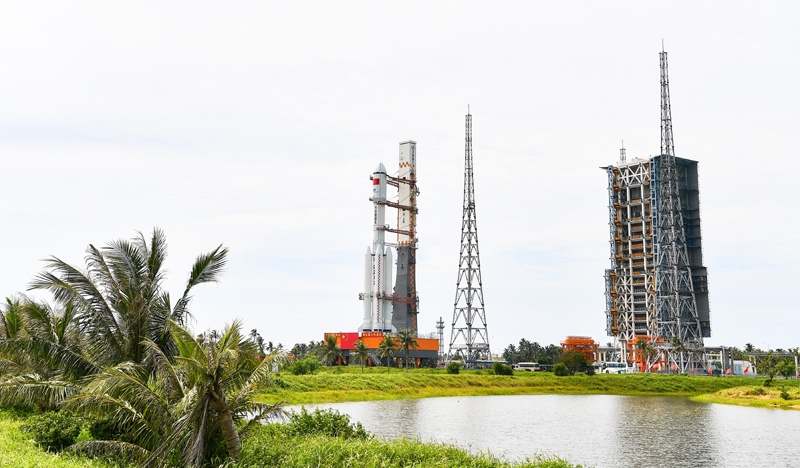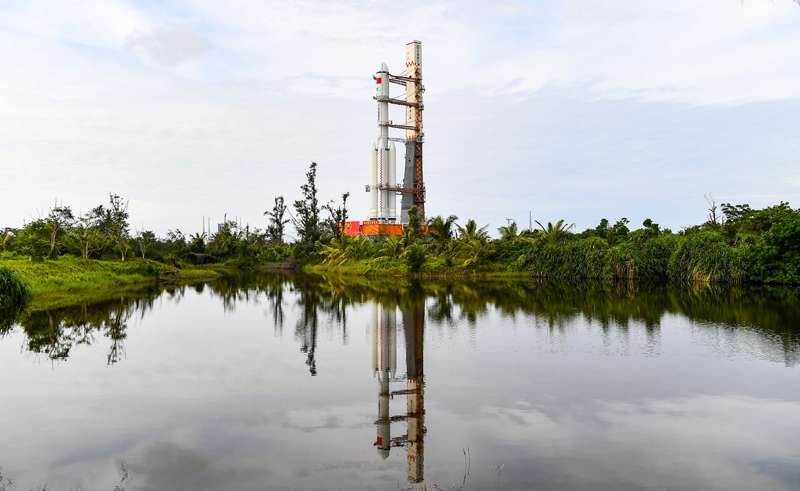 7月12日,天舟九號(hào)貨運(yùn)飛船與長征七號(hào)遙十運(yùn)載火箭組合體垂直轉(zhuǎn)運(yùn)中。