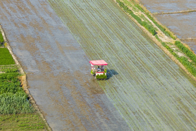 7月16日,在浙江省余姚市黃家埠鎮(zhèn)韓夏村,農(nóng)民駕駛插秧機在田間插種晚稻(無人機照片)。