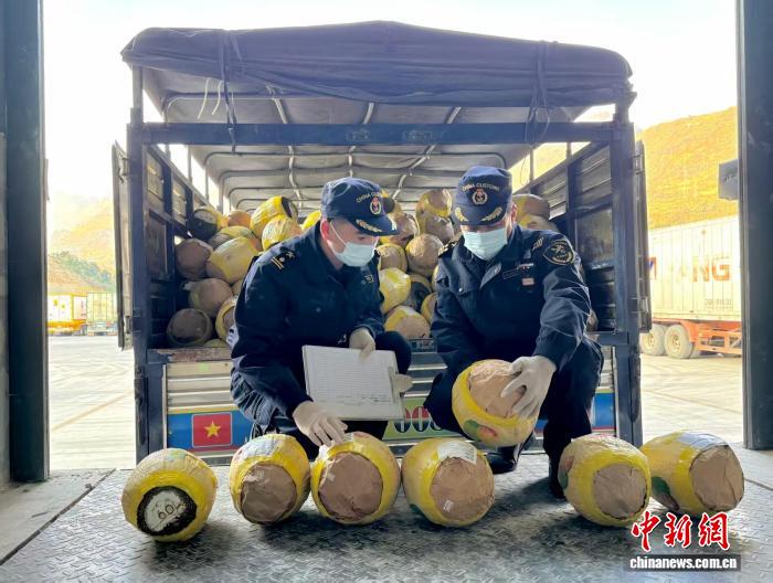 海關(guān)關(guān)員在天保口岸對進口越南菠蘿蜜進行查驗。萬應(yīng)超 攝