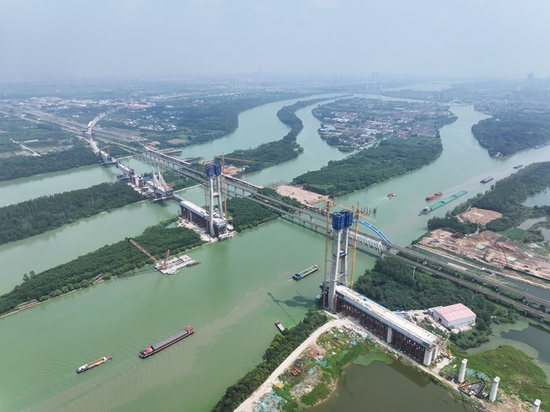 這是8月5日拍攝的滬渝蓉高鐵跨京杭運(yùn)河斜拉橋建設(shè)現(xiàn)場(chǎng)(無人機(jī)照片)。