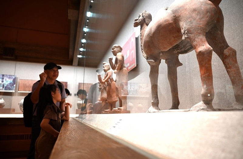8月10日,家長帶著孩子在甘肅省敦煌市博物館參觀文物展。