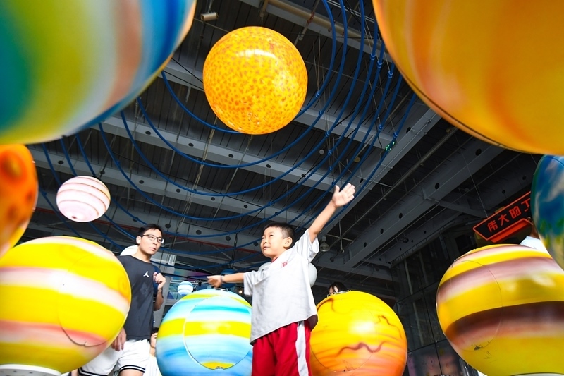8月10日,小朋友在南京科技館體驗科技裝置。