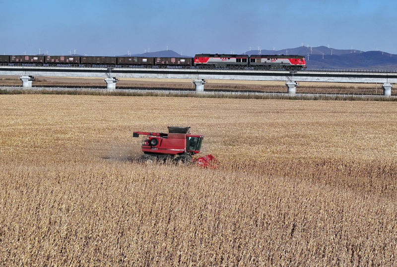 10月18日,一列滿載進(jìn)口物資的貨物列車駛向中國鐵路哈爾濱局集團有限公司綏芬河站(無人機照片)。