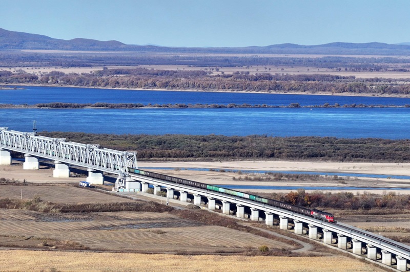 10月16日,滿載進(jìn)口物資的貨物列車通過同江鐵路大橋駛向中國鐵路哈爾濱局集團有限公司同江北站(無人機照片)。