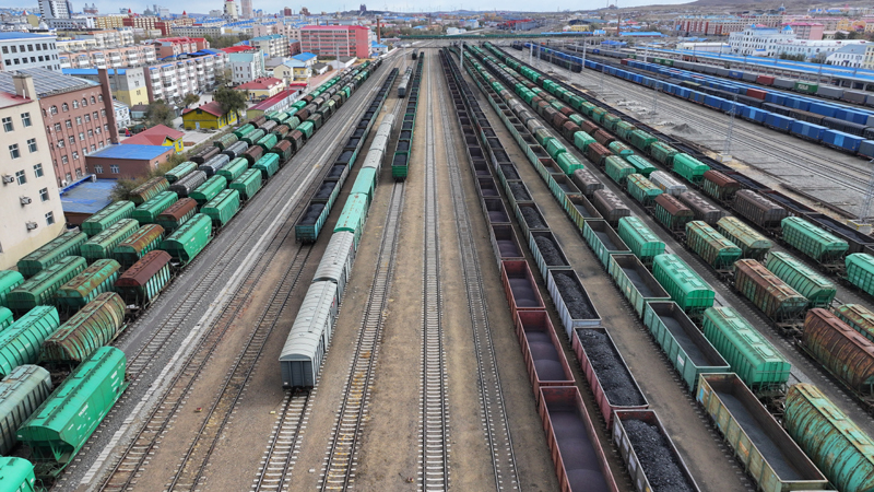 10月18日,在中國鐵路哈爾濱局集團有限公司綏芬河站南場,滿載進(jìn)口貨物的列車等待解體換裝(無人機照片)。
