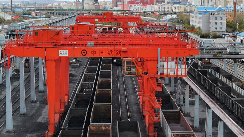 10月18日,在中國鐵路哈爾濱局集團有限公司滿洲里站,機械化換裝場在對進(jìn)口貨物進(jìn)行換裝作業(yè)(無人機照片)。