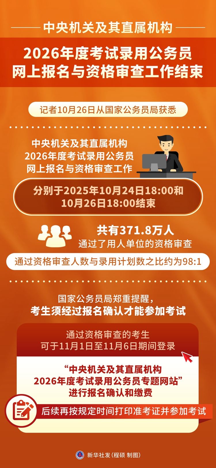 新華社北京10月26日電(記者范思翔)記者26日從國家公務員局獲悉,中央機關及其直屬機構2026年度考試錄用公務員網上報名與資格審查工作分別于2025年10月24日18:00和10月26日18:00結束,共有371.8萬人通過了用人單位的資格審查,通過資格審查人數與錄用計劃數之比約為98:1。
