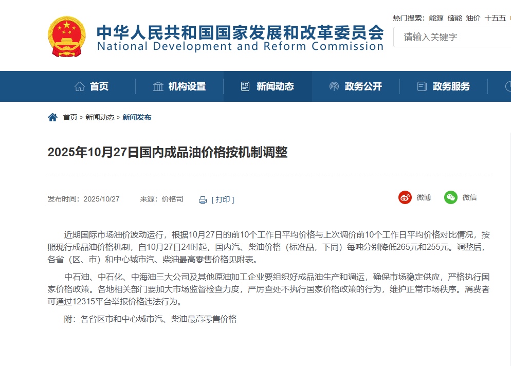 中國網(wǎng)10月27日訊 據(jù)國家發(fā)改委網(wǎng)站消息,近期國際市場油價波動運行,根據(jù)10月27日的前10個工作日平均價格與上次調(diào)價前10個工作日平均價格對比情況,按照現(xiàn)行成品油價格機制,自10月27日24時起,國內(nèi)汽、柴油價格(標(biāo)準(zhǔn)品,下同)每噸分別降低265元和255元。調(diào)整后,各?。▍^(qū)、市)和中心城市汽、柴油最高零售價格見附表。