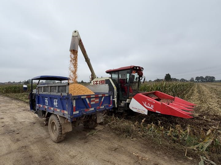 圖為一臺(tái)履帶式聯(lián)合收割機(jī)在陜西省武功縣長(zhǎng)寧鎮(zhèn)一處糧田完成收割后將玉米倒入運(yùn)糧車(chē)。新華社記者劉彤 攝