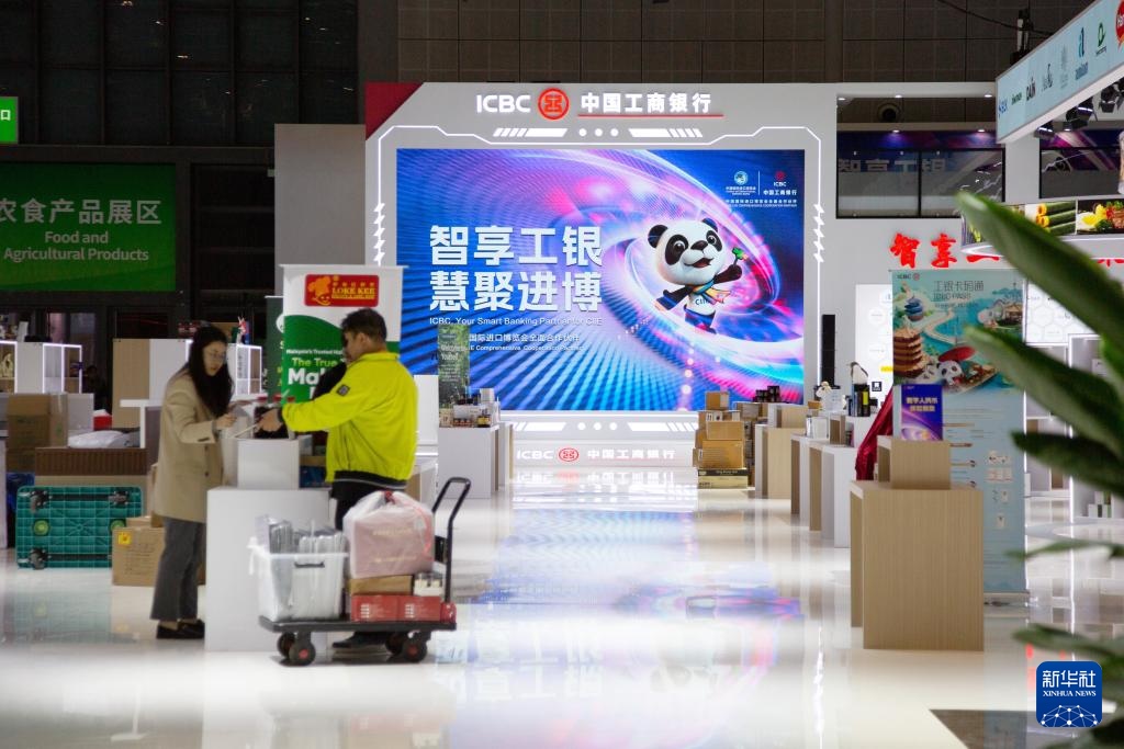 11月4日,工作人員在第八屆進博會農食產品展區(qū)進行準備工作。