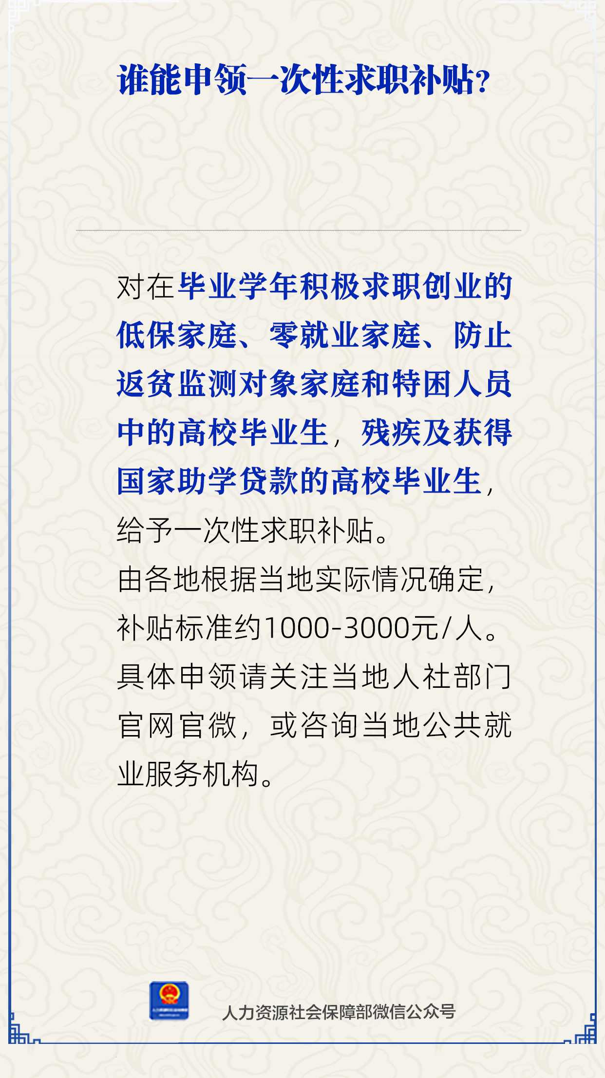 對(duì)在畢業(yè)學(xué)年積極求職創(chuàng)業(yè)的低保家庭、零就業(yè)家庭、防止返貧監(jiān)測(cè)對(duì)象家庭和特困人員中的高校畢業(yè)生,殘疾及獲得國家助學(xué)貸款的高校畢業(yè)生,給予一次性求職補(bǔ)貼。