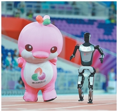 十五運(yùn)會(huì)賽場(chǎng),吉祥物與機(jī)器人互動(dòng)。本報(bào)記者 陶相安攝