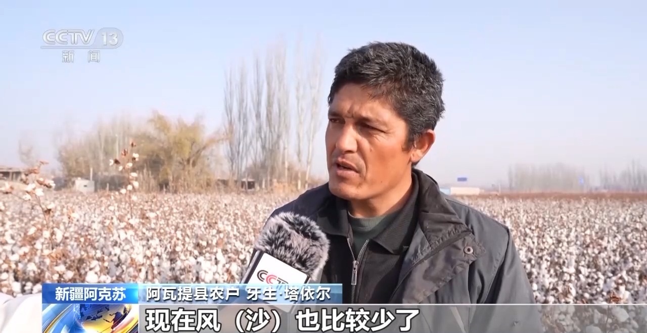 阿瓦提縣農戶 牙生·塔依爾:種樹之后天氣變得很好,現在風沙也比較少了,棉花白白的,以前棉花上黃黃的,土太多了,以前一畝地200到250公斤,現在350公斤。
