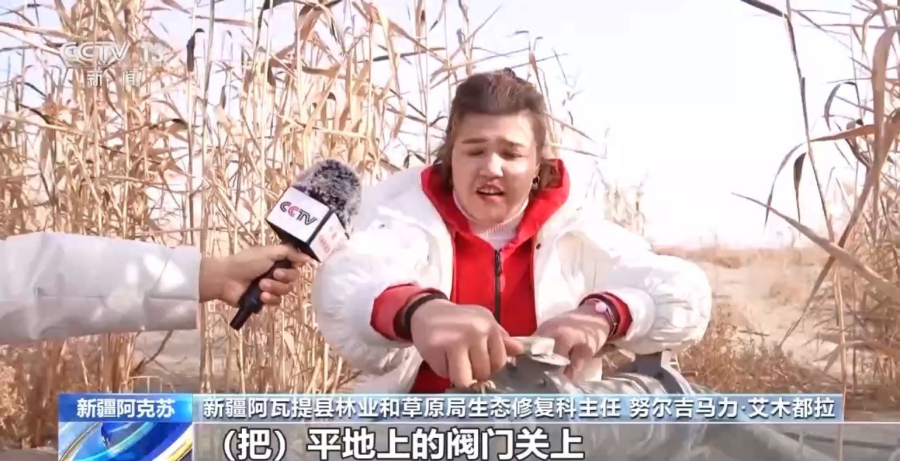新疆阿瓦提縣林業(yè)和草原局生態(tài)修復科主任 努爾吉馬力·艾木都拉:把平地上的閥門關上,然后把全部壓力給到高處沙包上的滴灌管道。再生水來了,水源充足以后,現在成活率達到75%以上了。