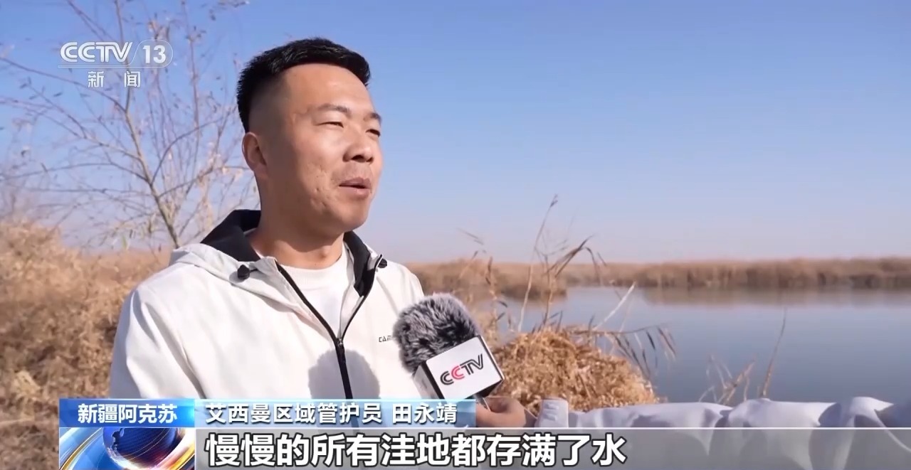 艾西曼區(qū)域管護員 田永靖:再生水過來之后,慢慢所有洼地都存滿了水,變成了現在所看到的濕地,這一大片的蘆葦現在長勢都特別不錯。