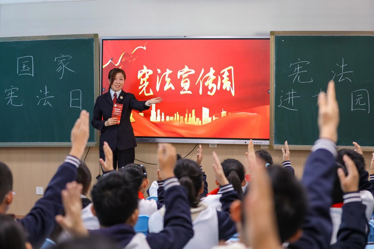 12月3日,山東省青島市李滄區(qū)人民檢察院檢察官走進(jìn)青島重慶中路學(xué)校,通過(guò)普及憲法知識(shí)、憲法誦讀、體驗(yàn)憲法宣誓等方式,讓學(xué)生們學(xué)習(xí)憲法知識(shí),增強(qiáng)法治觀念,弘揚(yáng)憲法精神。(工人日?qǐng)?bào)通訊員 張鷹 攝)