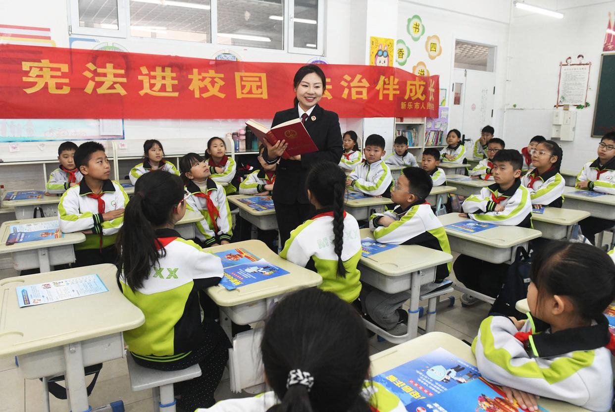 12月3日,在河北省石家莊新樂(lè)市民生街小學(xué),新樂(lè)市人民檢察院工作人員給學(xué)生講解憲法知識(shí)。(工人日?qǐng)?bào)通訊員 賈敏杰 攝)