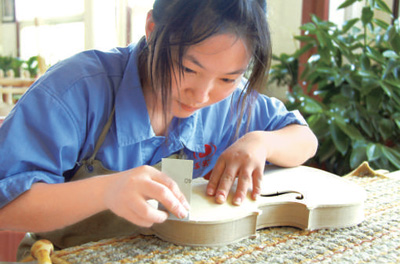 走進(jìn)華東樂(lè)器有限公司的生產(chǎn)車間,修弦枕、磨弦槽、打琴軸、上音柱、修琴碼……一道道工序正有條不紊地推進(jìn),35歲的郭增慧正熟練地組裝提琴?!皝?lái)這里之前,我就是一位普通的家庭主婦,干過(guò)很多份工作,音樂(lè)和提琴對(duì)我來(lái)說(shuō)是很遙遠(yuǎn)的東西。”郭增慧感慨。十年前,她從河北張家口嫁到東高村鎮(zhèn)附近的三河市,靠著家里的幾畝田地,生活并不富裕。在朋友的介紹下來(lái)到提琴?gòu)S,廠里的工資可觀,按件計(jì)酬,時(shí)間機(jī)動(dòng)靈活,可以隨時(shí)照顧家庭。于是,她在這兒一干就是十幾年。