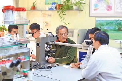 中國(guó)科學(xué)院院士宋微波(中)在指導(dǎo)學(xué)生開(kāi)展科研。