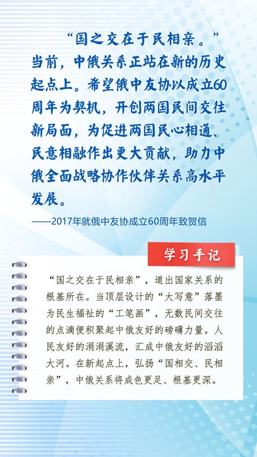 中華民族和俄羅斯民族都有悠久的歷史、古老的文明、燦爛的文化,都是偉大的民族。近年來,習近平主席常常引用中國詩詞古語、俄羅斯諺語名言等,寄語中俄關系發(fā)展和全人類和平與發(fā)展。這些重要論述,蘊含對文明、歷史的深邃思考,指引著新時代的中俄關系不斷向前,為世界百年變局中的人類文明進步事業(yè)指明方向。
