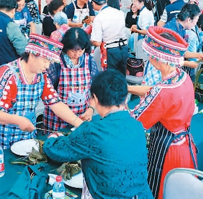 圖為京臺兩地同胞一同體驗包粽子。北京市臺辦供圖
