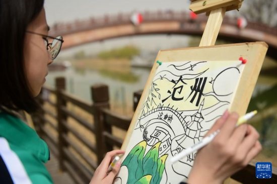3月28日,參加公益研學(xué)活動(dòng)的學(xué)生在描畫(huà)運(yùn)河景色。