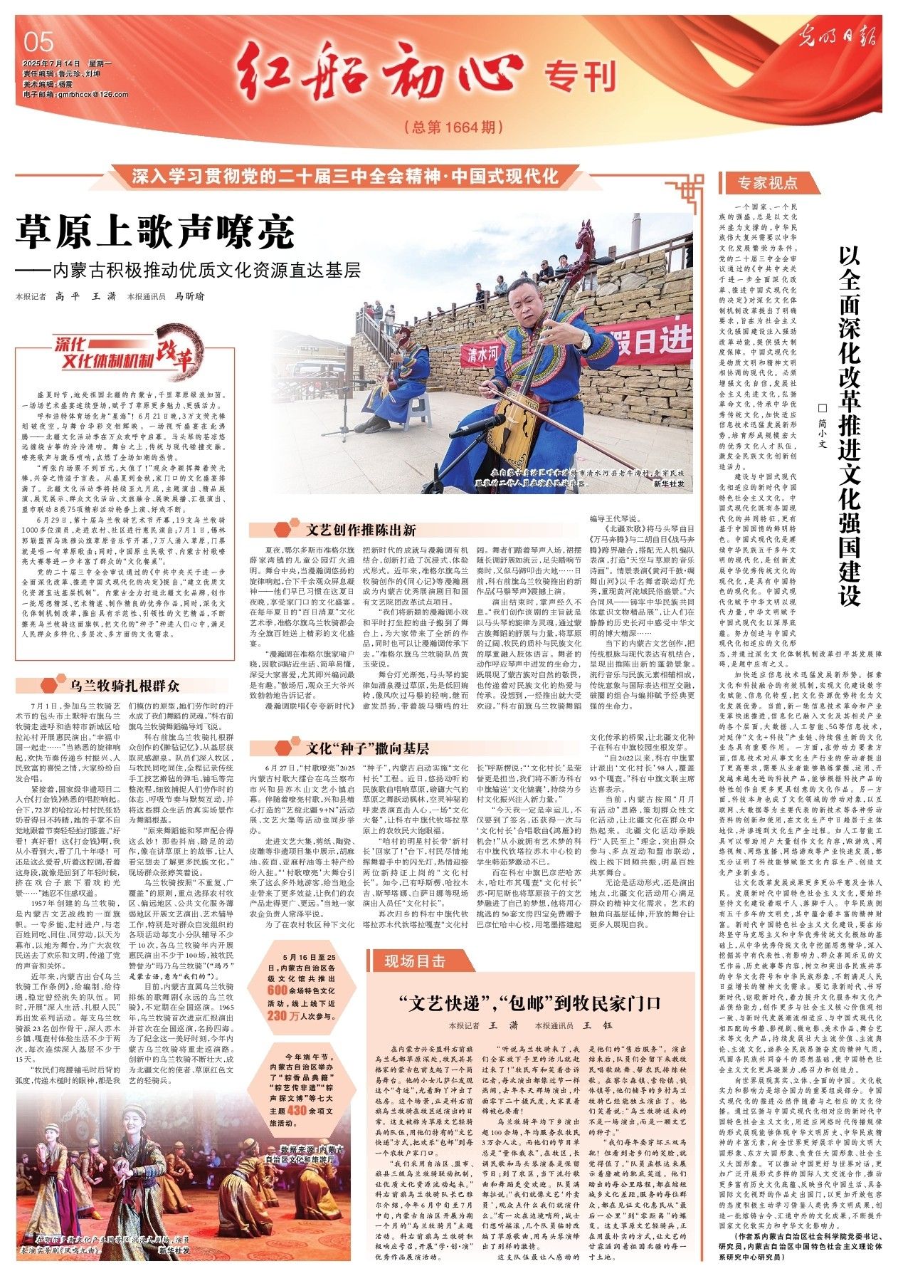 2025年7月14日,《光明日報(bào)》第5版刊發(fā)題為《草原上歌聲嘹亮——內(nèi)蒙古積極推動優(yōu)質(zhì)文化資源直達(dá)基層》的文章,報(bào)道了盛夏時節(jié),地處祖國北疆的內(nèi)蒙古,千里草原綠浪如茵。一場場藝術(shù)盛宴連續(xù)登場,賦予了草原更多魅力、更強(qiáng)活力。