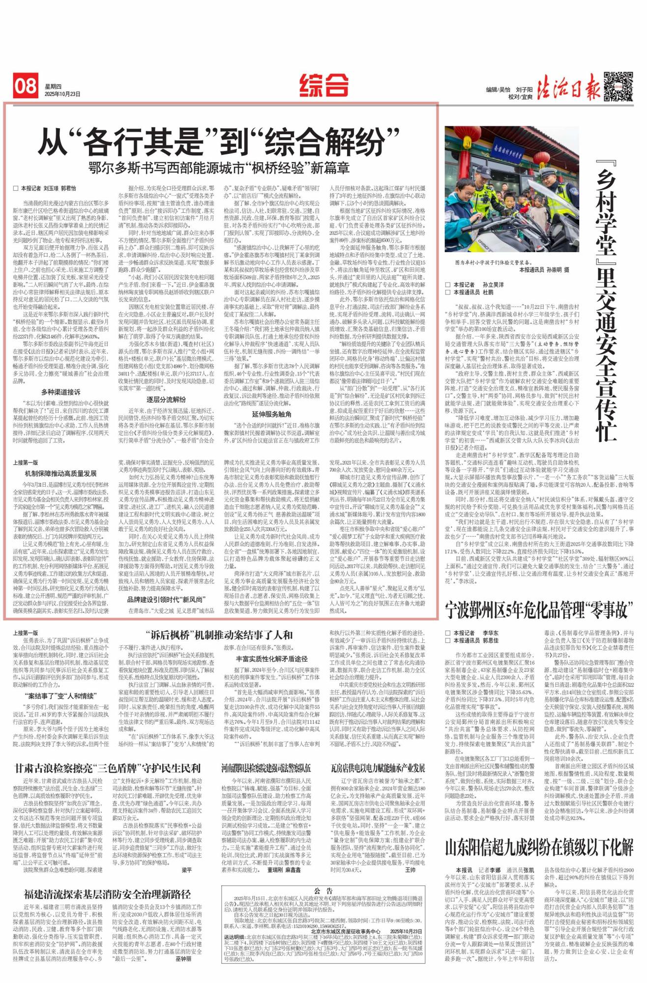 2025年10月23日,《法治日?qǐng)?bào)》第8版刊發(fā)題為《從“各行其是”到“綜合解紛”鄂爾多斯書寫西部能源城市“楓橋經(jīng)驗(yàn)”新篇章》的文章,報(bào)道了鄂爾多斯市以綜治中心規(guī)范化建設(shè)為核心,深入踐行新時(shí)代“楓橋經(jīng)驗(yàn)”,通過多元舉措化解矛盾糾紛,全力打造“暖城善治”社會(huì)治理品牌。截至9月底,全市各級(jí)綜治中心累計(jì)受理各類矛盾糾紛22371件,化解率達(dá)96.03%。