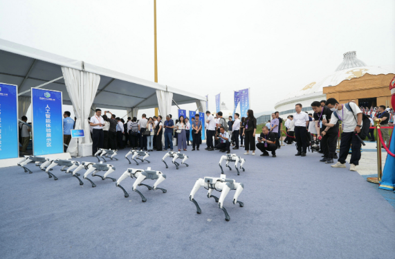 7月12日,2025綠色算力大會在呼和浩特開幕,圖為工作人員通過鍵盤操控機器狗進行表演。