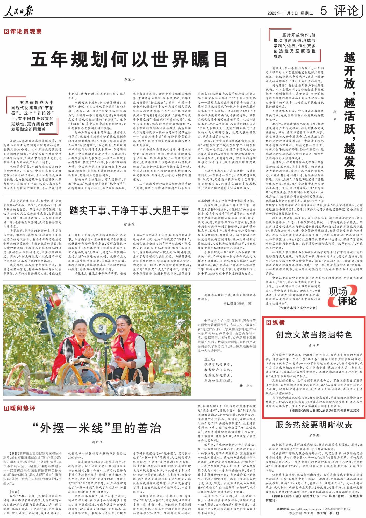2025年11月5日,《人民日報》第5版刊發(fā)題為《創(chuàng)意文旅當(dāng)挖掘特色》的評論,評論通過講述不少地方將“瑞士卷”玩出了新花樣,強調(diào)文旅創(chuàng)新的核心,在于喚醒資源的生命力。